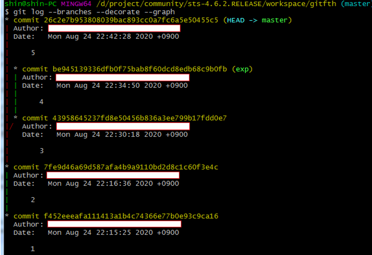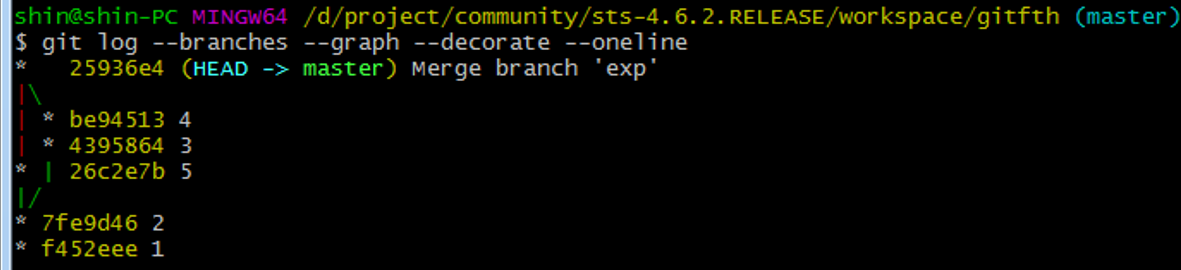 > exp 에서 작업한 4번과, master에서 작업한 3,5번을 부모로 갖는다. 즉 4번이 마지막 exp 커밋 파일 5번이 없다.