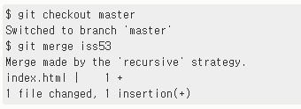 Iss53 작업이 끝나면 위처럼 master브랜치로 변경하여 merge를 진행한다.