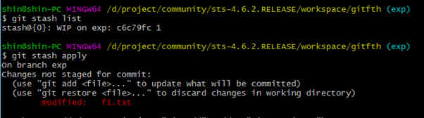 2. git stash apply : 이를 통해 임시저장 내역 중 가장 최신 것을 다시 불러와 modified 상태로 돌아옴