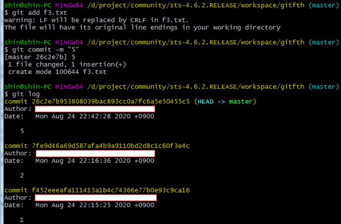 > 1,2,5 커밋은 master에서 이루어진 것이고