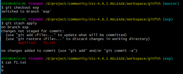 2. git stash apply : 감추어 두었던 소스를 다시 불러온다.