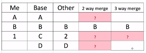 * 2way merge : base가 없다고 생각해보자 > 1번라인 : Me와 Other 브랜치가 다르므로 뭐가 맞는지 알 수 없다. > 2번라인 : 모두 같으므로 B > 3번라인 : Me와 Other 브랜치가 다르므로 뭐가 맞는지 알 수 없다. > 4번라인 : Me와 Other 브랜치가 다르므로 뭐가 맞는지 알 수 없다. * 3way merge : Base가 있다. > 1번라인 : Base와 A가 같으므로 수정자는 Other이므로 Other이 맞다. 이처럼 알수있다. |