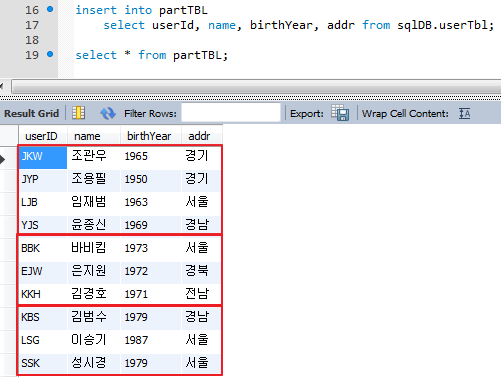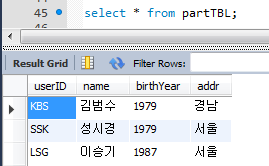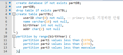 5. 파티션 테이블에는 Primary Key를 지정하면 안된다. 기본키로 지정하면 그 열로 정렬이 되기 때문에 파티션으로 하면 안된다. 만약 기본키로 지정하려면 파티션에서 사용되는 열도 함께 지정해야한다. 이 예는 userID와 birthYear를 함께 기본키로 지정해야한다.