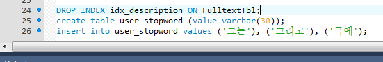 25. 사용자가 추가할 중지 단어를 저장할 테이블을 생성한다. 주의할 점은 테이블 이름은 아무거나 상관없으나 열 이름은 value와 varchar형태로 지정해야 한다.