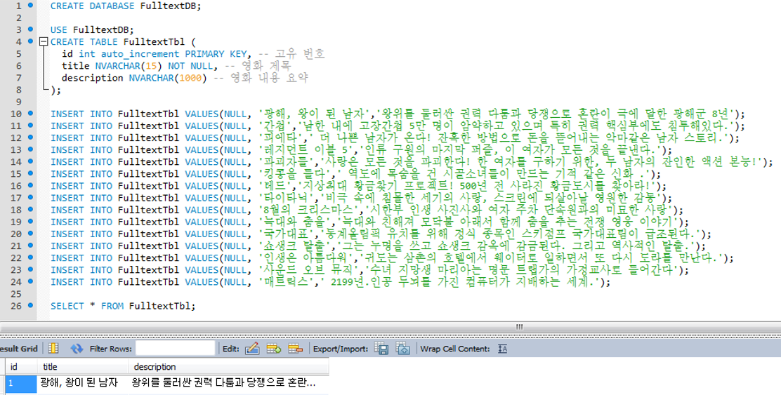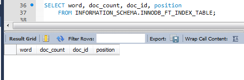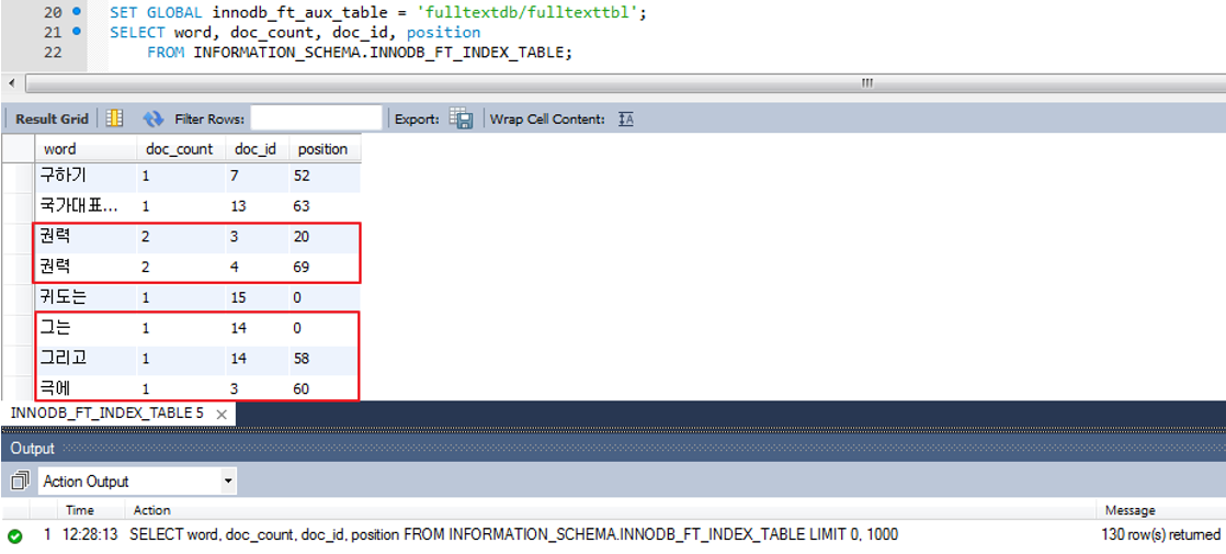 20~22. 위와 같은 쿼리로 전체텍스트 인덱스로 생성한 값들을 확인해볼수 있다.
