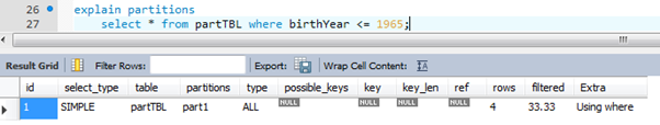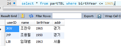 1965년 이전에 출생한 회원을 조회해보자. 이는 파티션1만 조회해서 결과를 가져왔을 것이다. 실제 대용량 데이터였다면 파티션2와 파티션3은 아예 접근하지도 않았으므로 상당히 효율적인 조회를 한 것이다.