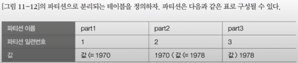 10. 파티션 테이블을 지정하는 문법은 테이블의 정의가 끝나는 부분에 partition by range(열이름)로 지정한다. 그러면 열 이름의 값에 의해 지정된 파티션으로 저장된다. 주의할 점은 열 이름은 숫자형의 데이터여야 하며 문자형은 오면 안된다는 것이다.