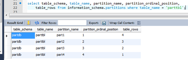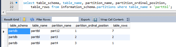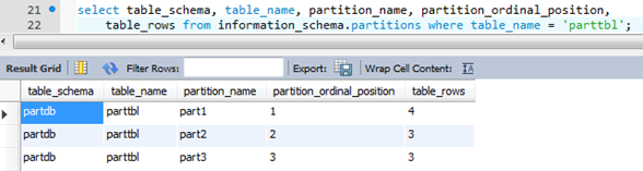 21. 파티션을 확인. 파티션 이름, 파티션 일련번호, 파티션에 저장된 행 개수 등을 알 수 있다.