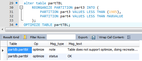 29~33. 만약 파티션3을 1979~1985(파티션3)와 1986 이후(파티션4)로 분리하고자 한다면 alter table … reorganize partition문을 사용.