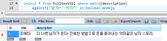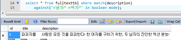 +연산자로 남자, 여자가 필수로 들어가는 문장을 검색한다.