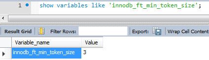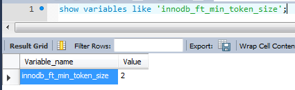 MySQL은 기본적으로 3글자 이상만 전체 텍스트 인덱스로 생성한다. 이러한 설정을 2글자까지 전체 텍스트 인덱스가 생성되도록 시스템 변수값을 설정해보자.