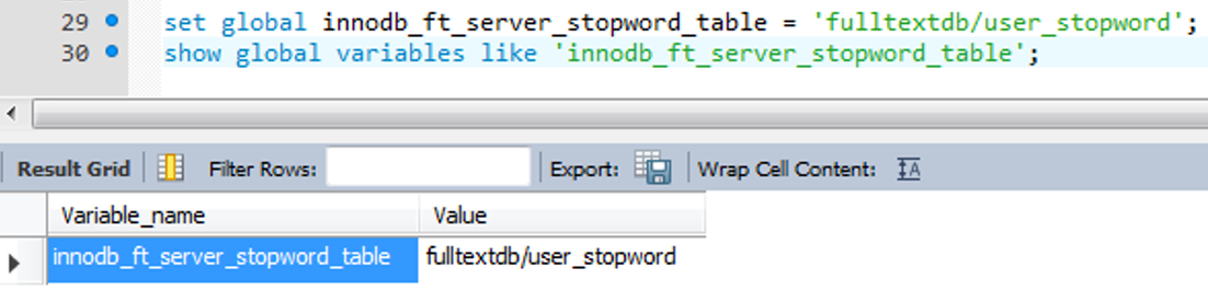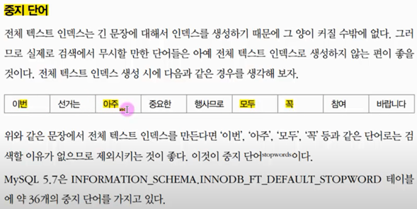중지 단어용 테이블을 시스템 변수 innodb_ft_server_stopword_table에 설정해야한다. 주의할 점은 홀따옴표 안의 DB이름과 테이블 이름은 모두 소문자로 써야한다.