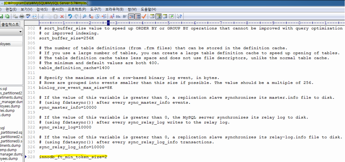2글자 이상을 전체텍스트 검색으로 사용하려면 위처럼 ini파일에 추가해주고 서비스를 재시작해야함.
