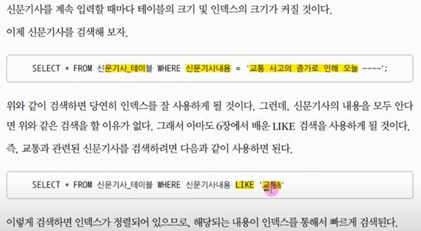 2. 앞글자 like검색도 인덱스를 통하여 위위사진(신문기사 인덱스)처럼 정렬되어 있기에 검색이 빠르다.