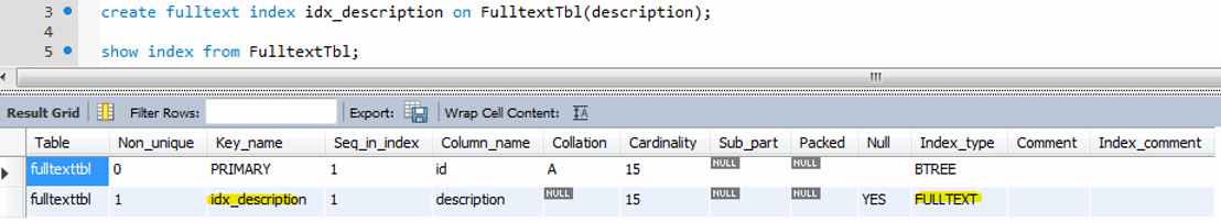 전체 텍스트 인덱스를 생성하고 인덱스 정보를 확인해 보자.