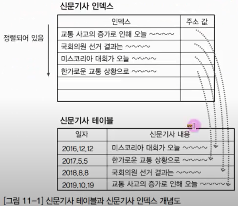 신문기사 테이블(아래표)을 생성하고, 일반 인덱스(위표)를 생성했다고 가정해보자.