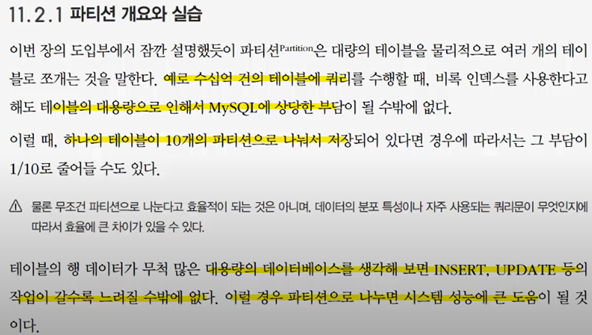 파티션을 나눌때는 예로 10년간의 데이터가 저장된 테이블이라면, 아마도 과거의 데이터들은 주로 조회만 할 뿐 거의 변경이 되지 않을 것이다. 그러므로 작년 이전의 데이터와 올해의 데이터를 서로 다른 파티션에 저장한다면 효과적일 수 있다.