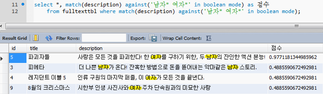 11. select 문장안에 match를 사용하면 매치되는 점수가 매겨진다.
