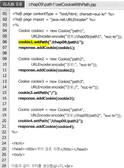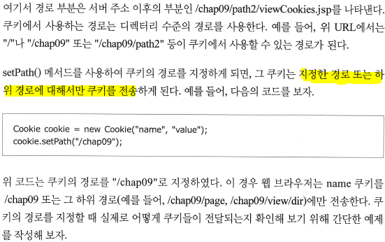 setPath를 지정하지 않으면 실행한 JSP페이지 경로를 사용한다. 즉 path2 쿠키는 /chap09/path1 경로를 기준으로 전송된다.