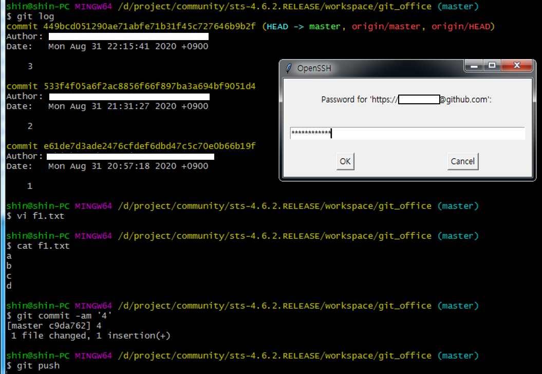이때 아이디 패스워드를 묻지 않는 이유는 공개저장소를 쓰고 있기 때문.