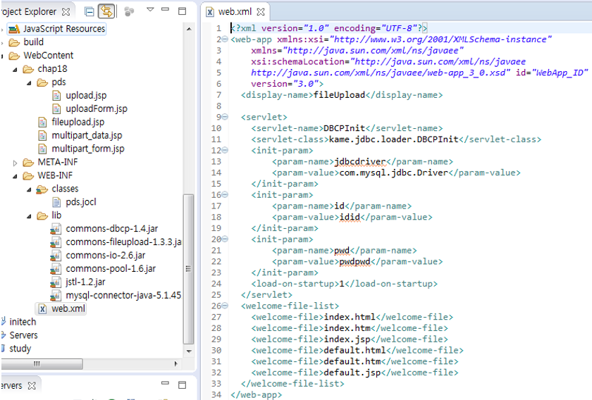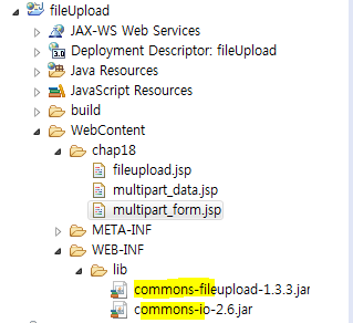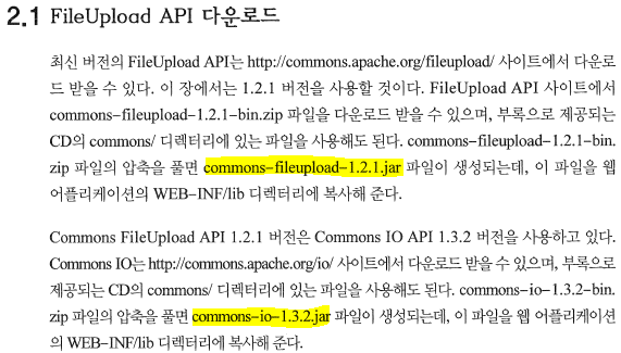 파일업로드 관련 jar파일 (위의 예제처럼 클래스를 직접 작성해서 jar파일 없이도 파일업로드는 가능하다.) 편의를 위해 사용