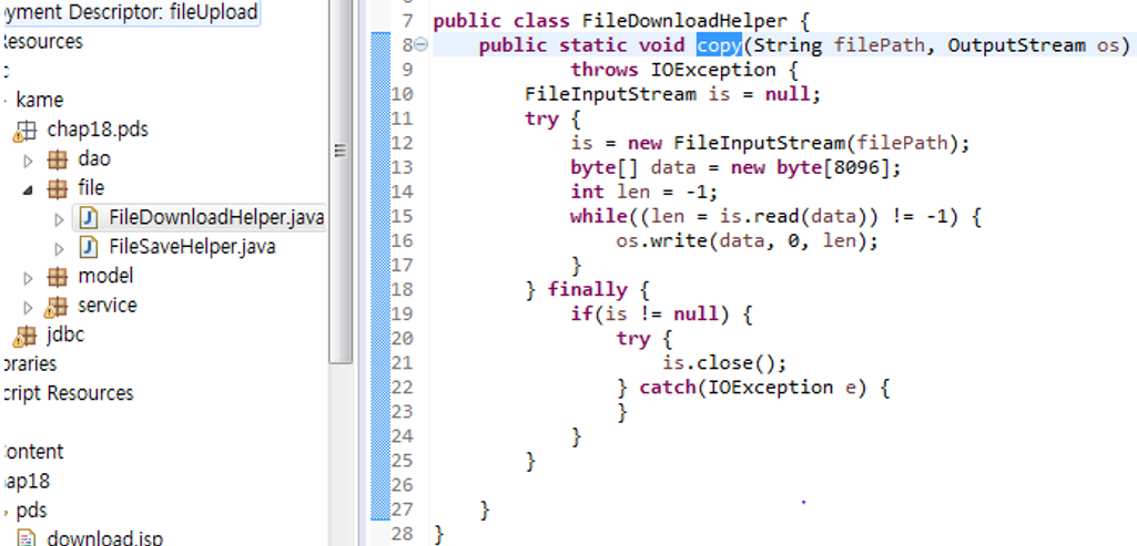 24. read(8096) : 8096만큼 읽고 그 수를 리턴 즉 -1이 될때까지 outputStream에 씀(여기서 파일이 생성됨). 파일을 계속 읽음 8096씩(몇 기가든 상관없음)