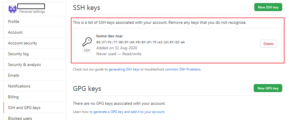 SSH 메뉴 클릭 후 > New SSH key 클릭