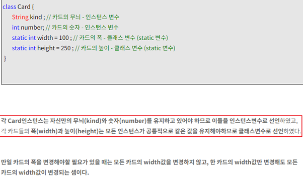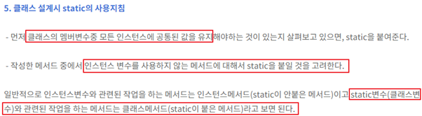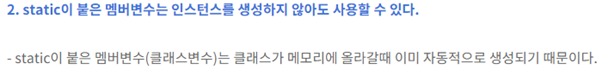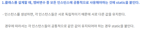 첫째로, static을 쓴 변수나 메소드는 객체생성없이 모든 객체가 아무런 제약없이 공유할수 있다. 물론 객체생성하고 써도 상관없다.