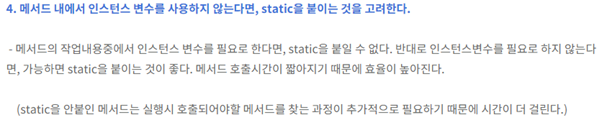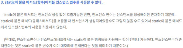 Static 메서드에는 인스턴스 변수가 올 수 없다 당연하다. 스태틱 메서드는 인스턴스를 생성안하고도 호출할 수 있으니까