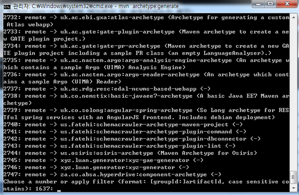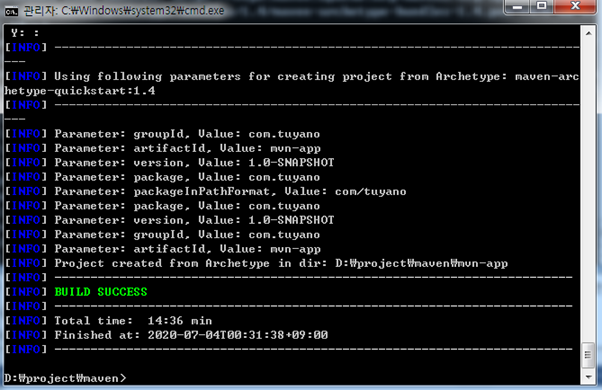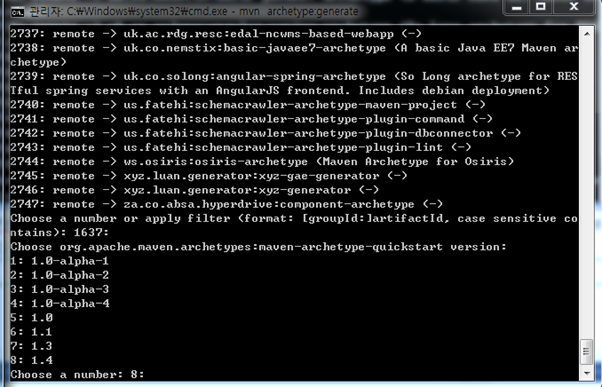 아키타입은 프로젝트 템플릿 모음입니다. 이곳에 번호를 지정하면 그 아키타입에 따라 프로젝트를 생성한다. 기본값은 maven-archetype-quickstart 이다. 기본값이 지정되도록 엔터