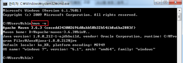 Cmd 창에서 mvn –v 를 통해 메이븐이 잘 설정되었는지 확인