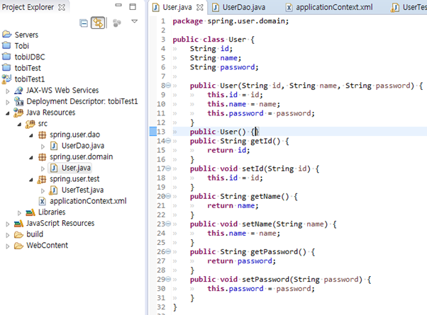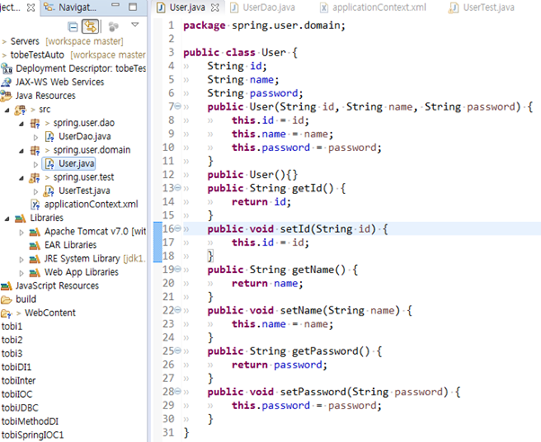22. @ContextConfiguration : 테스트 컨텍스트가 자동으로 만들어줄 어플리케이션 컨텍스트의 위치지정. 로케이션을 통해 설정파일 경로를 지정해줄 수도 있고, 로케이션이 없을시 <클래스이름+’-context.xml’ 파일을 사용하는 어플리케이션 컨텍스트로 만들어서 테스트가 사용할 수 있게 해줌. (위의 클래스이름을 예로들면 UserTest-context.xml 로 만들어주면 생략가능)