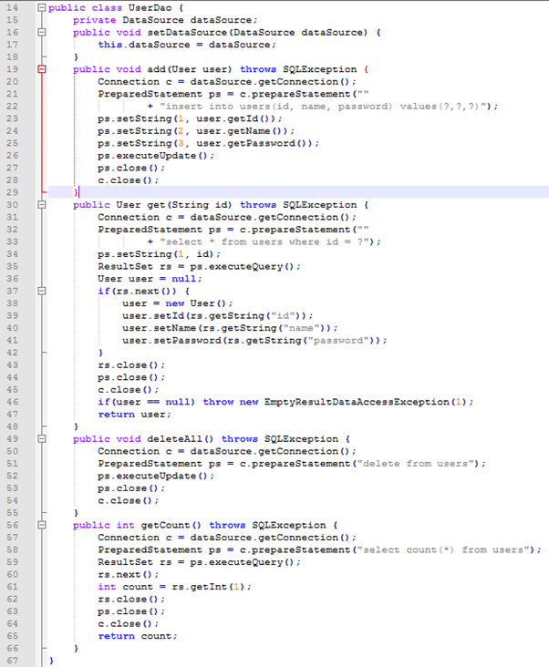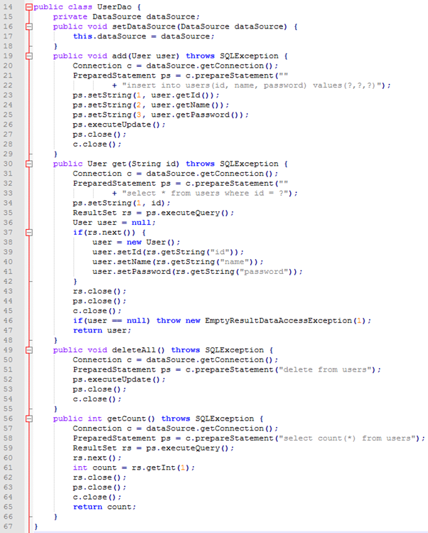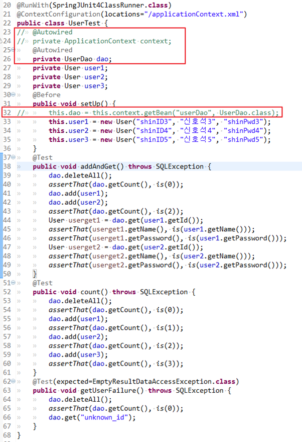 35. 아예 스프링 컨테이너를 사용하지 않고 테스트 코드의 수동DI만을 이용해 만들어진 테스트코드이다. @Autowired를 사용하지 않고 직접 DI 해줬다. DataSource를 직접 만드는 번거로움은 있지만 어플리케이션 컨텍스트를 사용하지 않으니 코드는 더 단순해지고 이해하기 편해졌다. Junit은 매번 새로운 오브젝트를 만들기 때문에 매번 새로운 UserDao 오브젝트가 만들어진다는 단점이 있다.