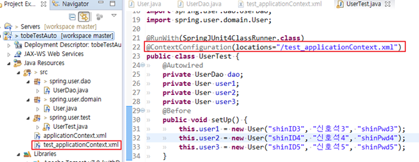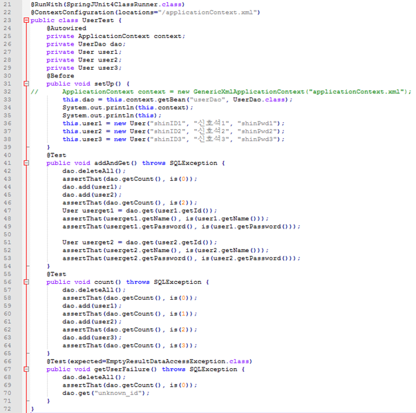 22. @ContextConfiguration : 테스트 컨텍스트가 자동으로 만들어줄 어플리케이션 컨텍스트의 위치지정. 로케이션을 통해 설정파일 경로를 지정해줄 수도 있고, 로케이션이 없을시 <클래스이름+’-context.xml’ 파일을 사용하는 어플리케이션 컨텍스트로 만들어서 테스트가 사용할 수 있게 해줌. (위의 클래스이름을 예로들면 UserTest-context.xml 로 만들어주면 생략가능)