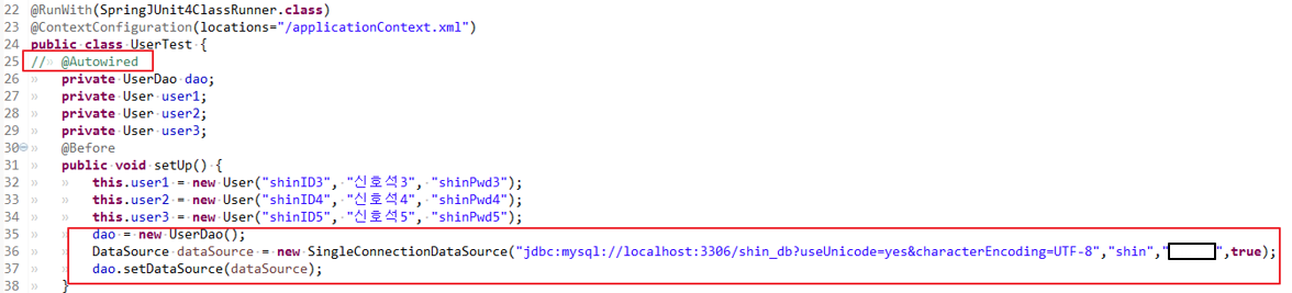 35. 아예 스프링 컨테이너를 사용하지 않고 테스트 코드의 수동DI만을 이용해 만들어진 테스트코드이다. @Autowired를 사용하지 않고 직접 DI 해줬다. DataSource를 직접 만드는 번거로움은 있지만 어플리케이션 컨텍스트를 사용하지 않으니 코드는 더 단순해지고 이해하기 편해졌다. Junit은 매번 새로운 오브젝트를 만들기 때문에 매번 새로운 UserDao 오브젝트가 만들어진다는 단점이 있다.