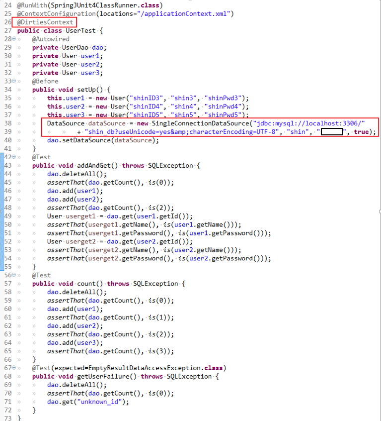 만약 applicationContext.xml 의 DB설정이 운영용DB라고 생각해보자 deleteAll()에 의해 운영용 데이터가 다 날라갈 것이다. 테스트를 위해 applicationContext를 직접 수정해주는 방법도 있겠지만 번거롭고 위험한 방법이다. 평범한 자바 테스트 코드에서도 얼마든지 DI가 가능하다.
