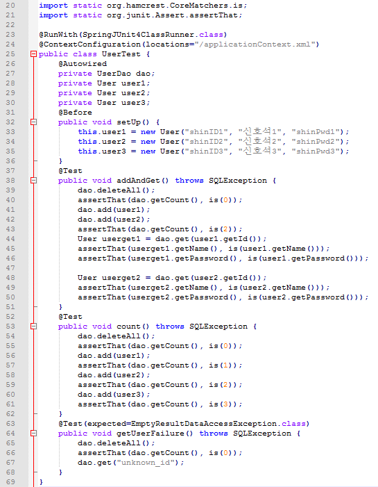 - @ContextConfiguration(경로) : 자동으로 만들어줄 어플리케이션 컨텍스트 설정파일