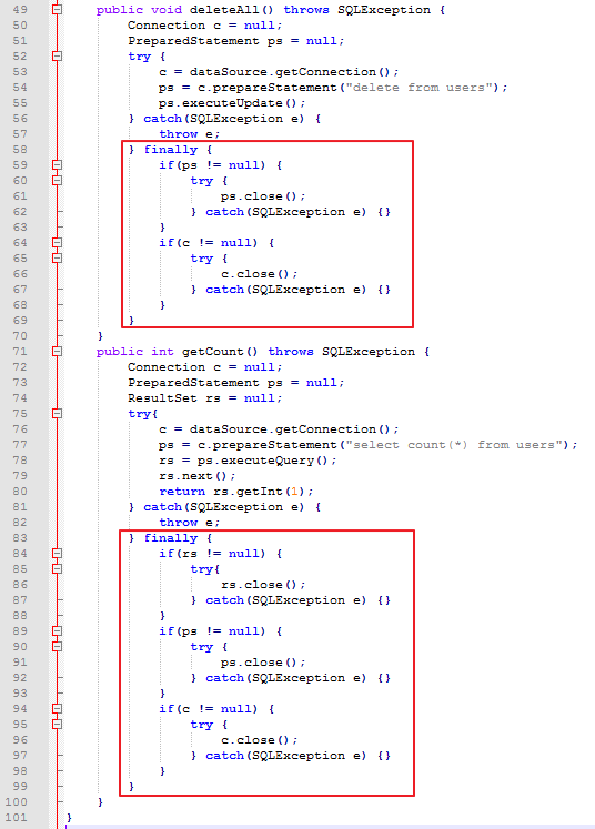 86. close()에서도 SQLException이 발생할 수 있으므로 이를 잡아줘야함. 그렇지 않으면 ps, c변수를 close 안해주고 메소드를 빠져나감