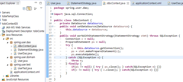 28. excuteSql 메소드는 UserDao만 사용하기엔 아까운 재사용 가능한 콜백을 담고 있는 메소드라면 DAO가 공유할 수 있는 템플릿 클래스 안으로 옮겨도 된다. 엄밀히 말해 템플릿은 JdbcContext가 아닌 workWithStatementStrategy() 메소드 이므로, 재사용가능한 메소드를 옮긴다해도 문제될 것은 없음. 템플릿과 콜백의 공존