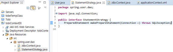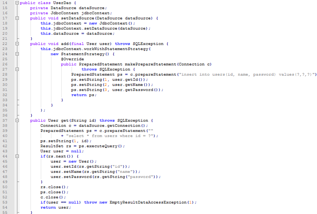 * 콜백 : (19.makePrepareStatement(콜백)) : 템플릿(JdbcContext)안에서 호출되는 것을 목적으로 만들어진 오브젝트. (시스템 > 사용자를 호출)실행되는 것을 목적으로 다른 오브젝트의 메소드에 전달되는 오브젝트. 자바에서는 메소드 자체를 파라미터로 전달할 방법이 없기 때문에 메소드가 담긴 오브젝트를 전달해야함.(functional object). 좀 더 구체적인 설명은 UserDao 부분 참조