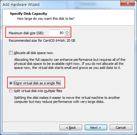 1. Allocate all ~ : 실제 80GB 하드를 생성함. 용량낭비에 비해 성능이 많이 좋아지지 않으므로 패스