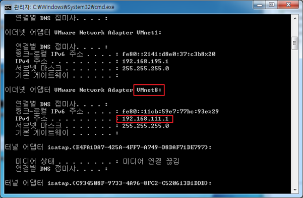 프롬프트 창에서 ipconfig를 통해 VMnet8 의 IP주소를 기억해두자