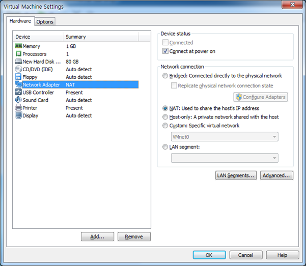 필요없는 Floppy, Audio, USB, Printer 장치는 제거한다.