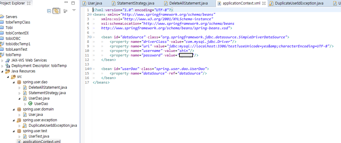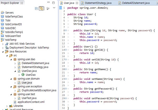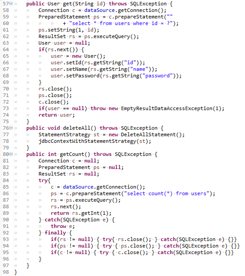 > 60. 예외포장 : DuplicatedUserIdException은 add 메소드에서 잡아서 대응 할 수 있지만 , 다른 SQLException은 대부분 복구 불가능한 예외이므로 잡아봤자 처리할 것도 없고, 결국 throws를 타고 계속 앞으로 전달되어 어플리케이션 밖으로 던져질 것이다. 그럴바에는 그냥 런타임 예외로 포장해 던져버려서 그 밖의 메소드들이 신경 쓰지 않게 해주는 편이 낫다. Throw를 통해 예외로 선언할 수 있으니 문제될 것은 없다.(예외난 곳을 로그로 알수 있기 때문)