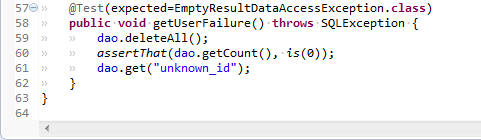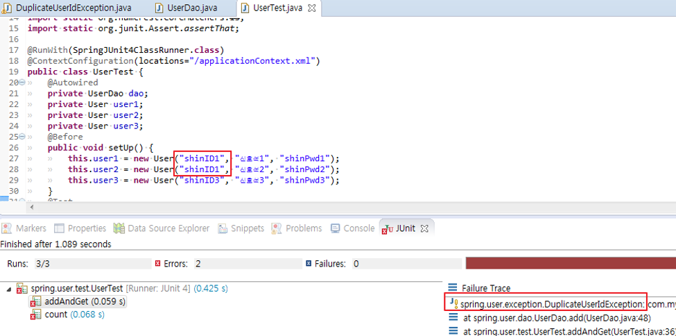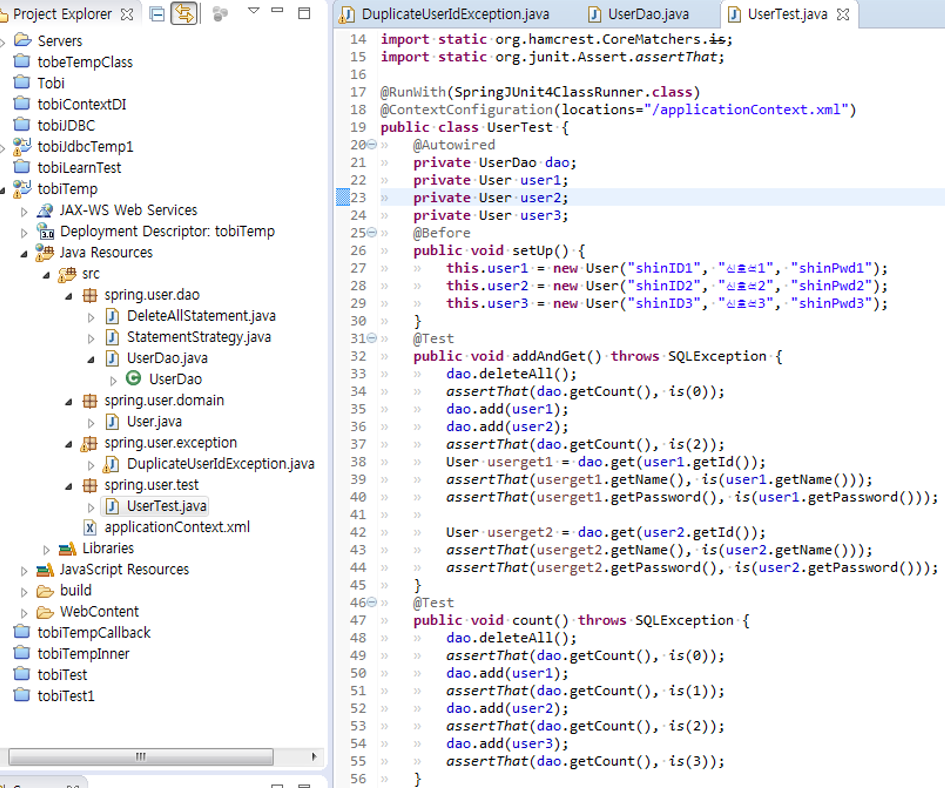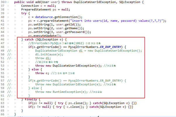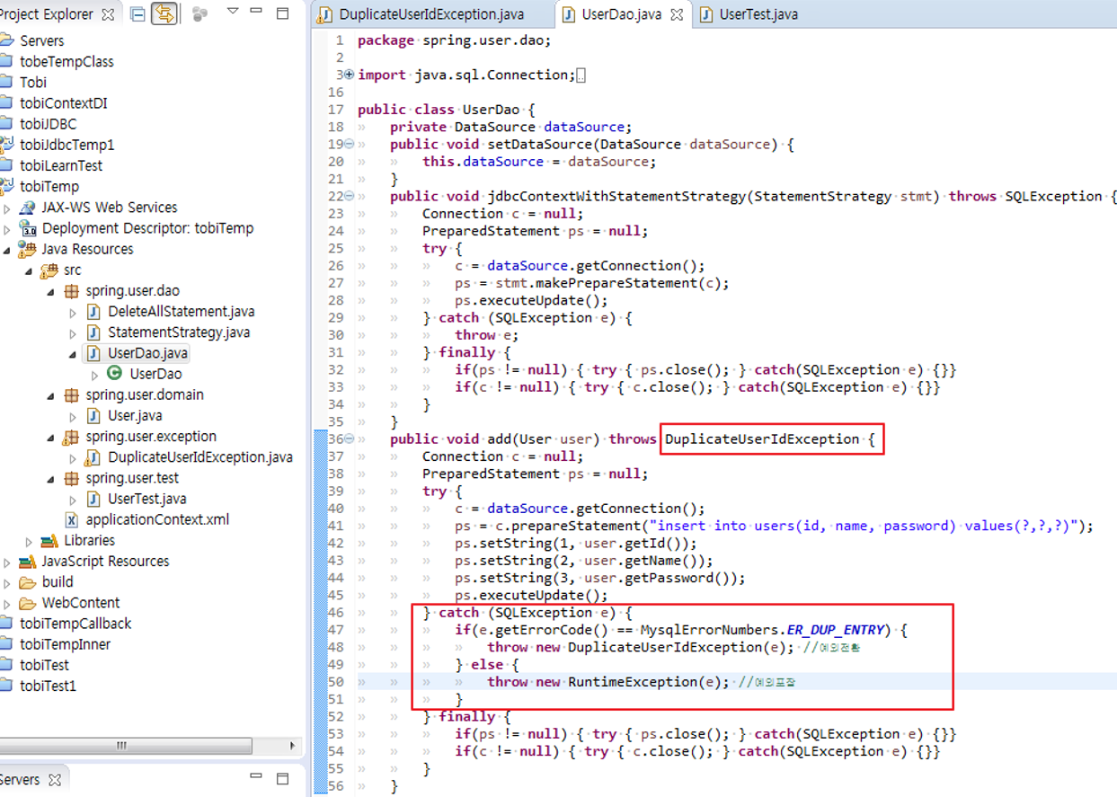 46~51로 인하여 이제 체크예외(SQLException)에서 언체크 예외로 변환되어 다른 곳에서 add메서드 사용시 throws는 포함시킬 필요가 없으며, 아이디 중복 상황을 처리하기 위한 DuplicateUserIdException을 이용해서 중복이라는 메시지를 던져준다던지, 아이디를 직접 제공해주는 로직 등 다양하게 이용할 수 있다.