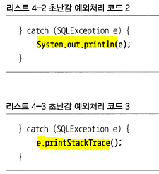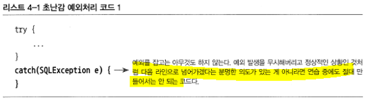 예외블랙홀 : 예외를 잡고 아무것도 안하겠다. 절대 만들어서는 안되는 코드. 예외를 무시하고 지나간다. 왜 안되는지 운영자는 찾기 힘들어 진다.