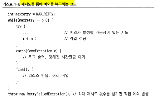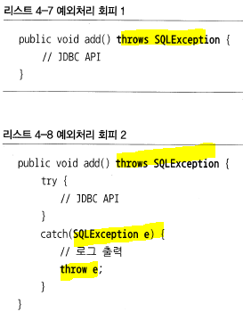 * 예외 회피 : 콜백/템플릿처럼 긴밀한 관계에 있는 다른 오브젝트에게 예외처리 책임을 분명히 지게하거나, 자신을 사용하는 쪽에서 예외를 다루는게 최선의 방법이라는 분명한 확신이 있을 경우 사용한다.