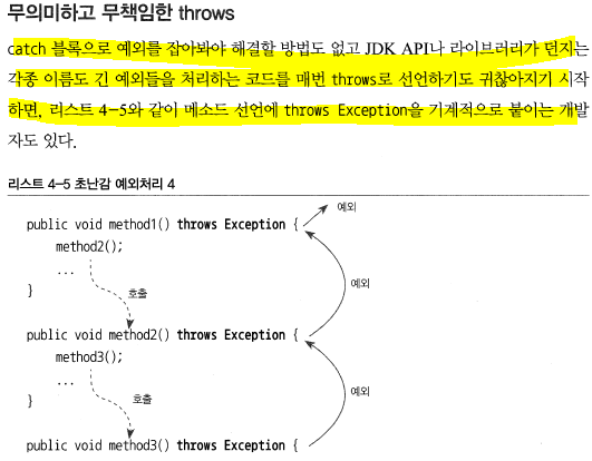 * 자바의 환경이 서버로 이동되면서 체크예외의 활용도와 가치는 점점 떨어지고 있다. 의미없는 throws 메소드를 낳을 뿐이다. 대응이 불가능한 체크 예외라면 런타임 예외로 전환해서 던지는게 낫다.