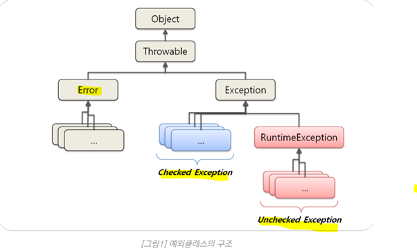 1. Java.lang.Error(좌측) : 주로 JVM이 발생시키는 것으로, OutOfMemoryError, ThreadDeath 같은 에러는 잡아봤자 아무런 대응 방법이 없다. 신경쓰지 않아도 된다.