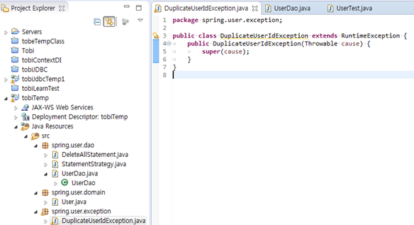 > 새로운 사용자 등록시 중복되는 사용자가 있을 경우 SQLException이 발생하면 쉽게 알 방법이 없다. DuplicateUserIdException 같은 예외로 바꿔 던져주면 서비스 계층 오브젝트에서 적절한 복구 작업을 시도할 수 있다.